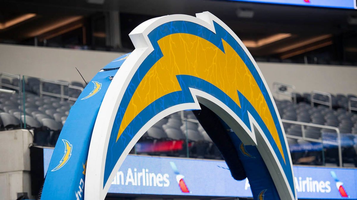 The Los Angeles Chargers logo before the Los Angeles Chargers The NFL football game between the Los Angeles Chargers and the New England Patriots took place on Sunday, October 31, 2021 in Inglewood, California. (AP Photo/Kyusung Gong, File)