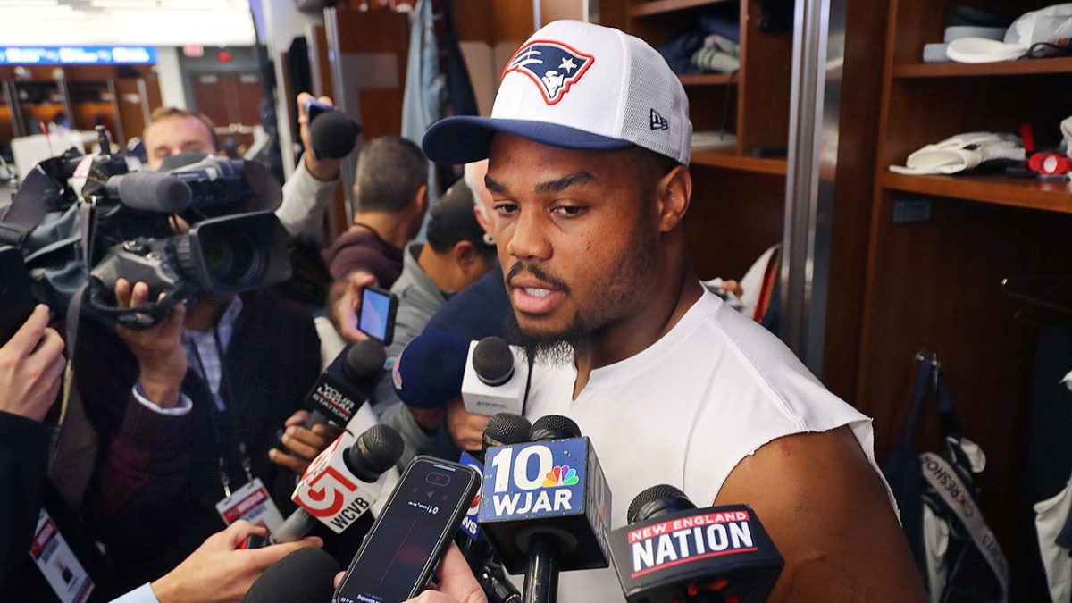 New England Patriots center Nick Leverett speaks to the media before practice. (John Turmacchi/Boston Globe via Getty Images)