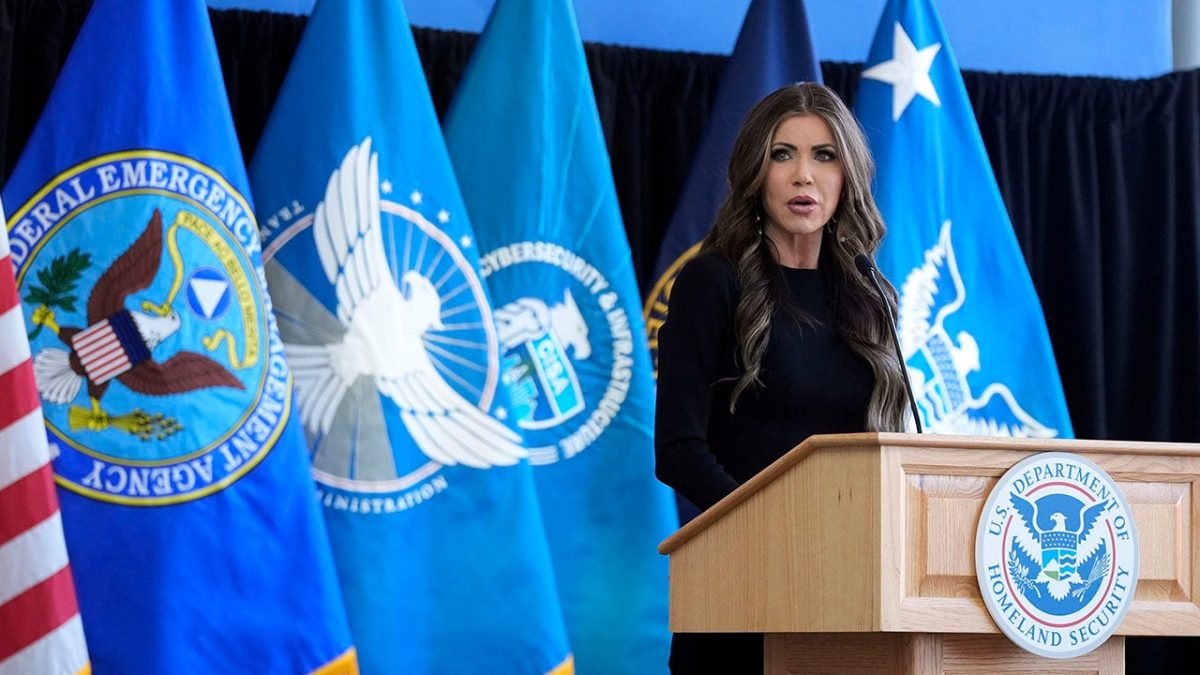 Homeland Security Secretary Christie Noem will speak to staff at DHS headquarters in Washington, DC on January 28, 2025. (Manuel Barth Seneto Pool/Getty Images)