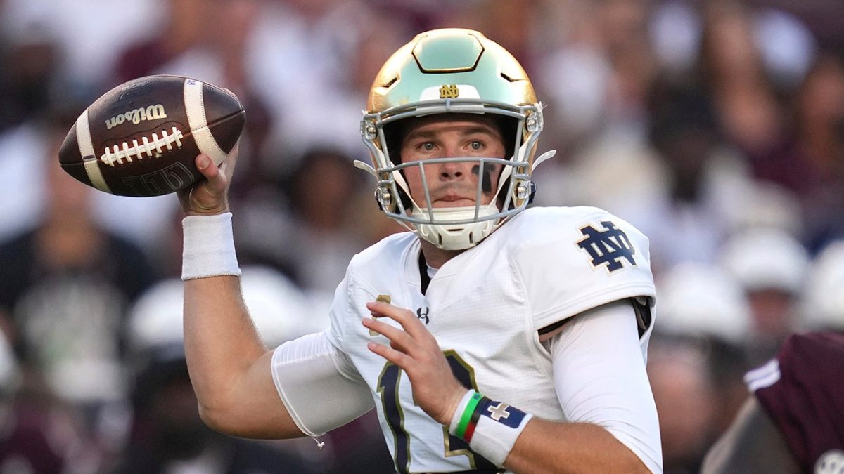 Notre Dame quarterback Riley Leonard (13) throws a pass against Texas A&M University during the first half of an NCAA college football game, Saturday, Aug. 31, 2024, in College Station, Texas. (AP Photo/Sam Craft)
