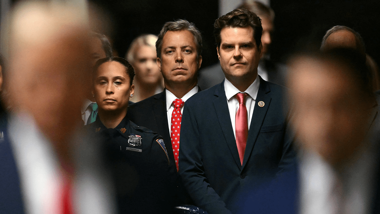 Matt listens as former US President Donald Trump speaks to reporters before his trial on charges of concealing hush money payments related to an extramarital affair in Manhattan Criminal Court in New York City on May 16, 2024. Congressman Gaetz (Republican of Florida).Angela Weiss/Pool via Reuters (Reuters)