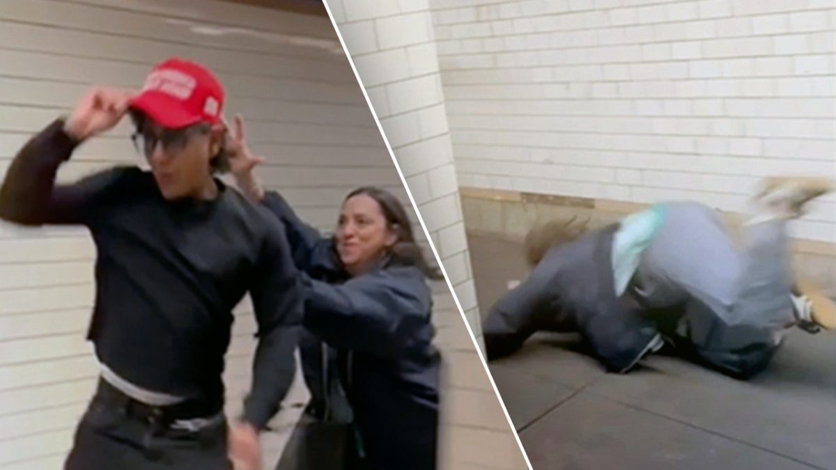 When the train stops, the woman chases after the man escapes the subway car and tries to remove the maga hat. However, in her attempt to steal the head with one big leap, the woman falls flat on her face as the man escapes.