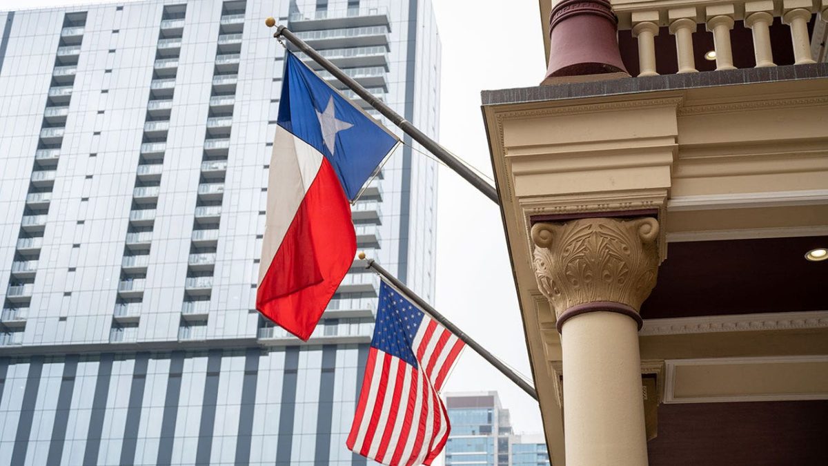 The Texas flag and the American flag fly together in a building in Austin, Texas, March 11, 2023 (Photo: Smith Collection/Gad/Getty Images) (Smith Collection/Gad/Getty Images/Getty Images)