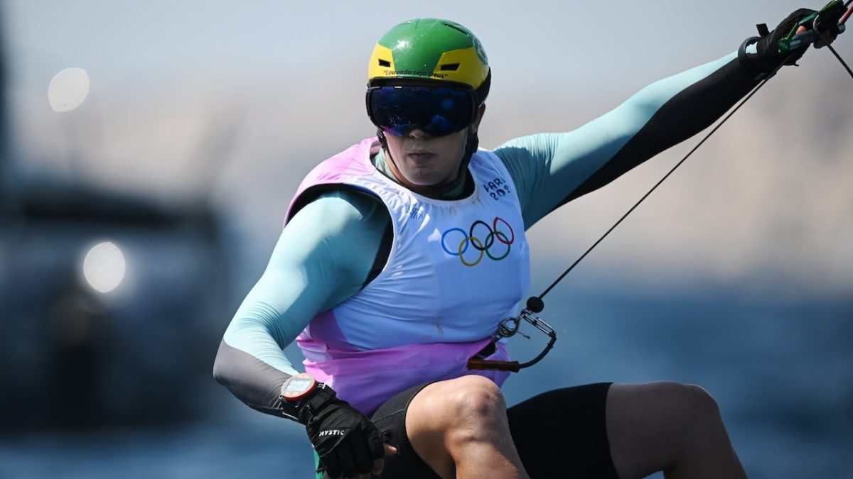 Bruno Lobo of Brazil competes in the men's kite event on day 13 of the 2024 Paris Olympics at Marseille Marina on August 8, 2024 in Marseille, France. (Clive Mason/Getty Images)