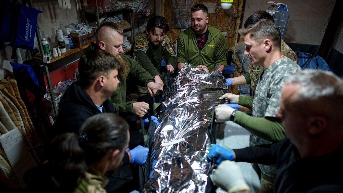 Ukrainian military medics from the 47th Brigade transfer a wounded comrade on a stretcher at a field hospital in the Avdiivka area of ​​Donetsk Oblast, Ukraine, on May 10, 2024. Only a few hundred residents remain in the battleground town of Vovtyansk in northeastern Ukraine. Kiev forces are engaged in heavy fighting with Russian forces, local officials said on Monday. (AP Photo/Evgeny Maloletka)