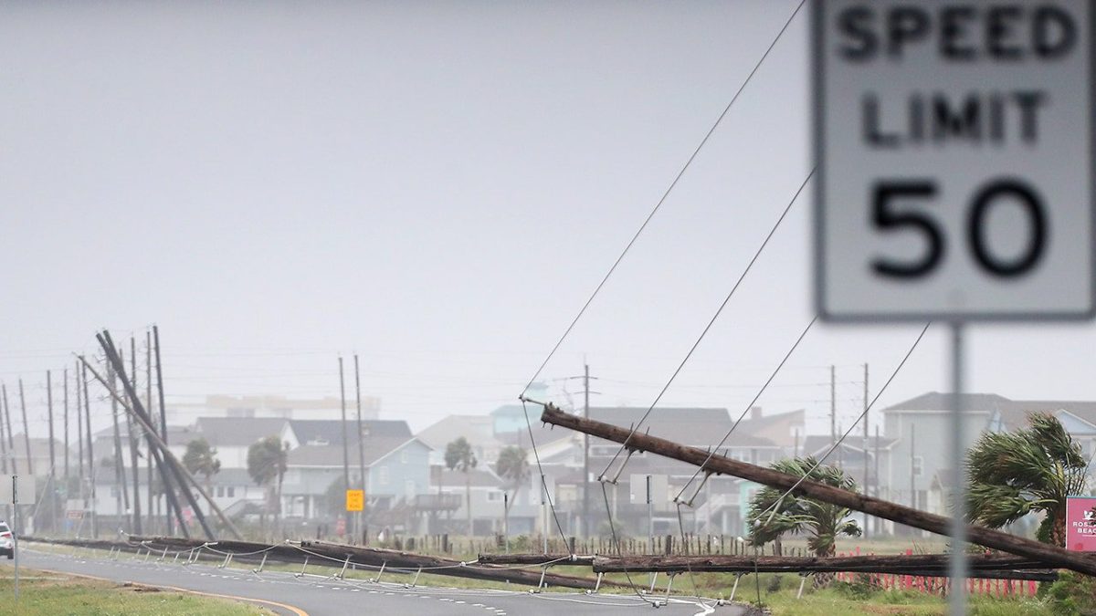 Downed power lines on Termini-San Luis Pass Road in Galveston Island, Texas, Monday, July 8, 2024, during the effects of Hurricane Beryl. (Elizabeth Conley/Houston Chronicle via Getty Images/Getty Images)