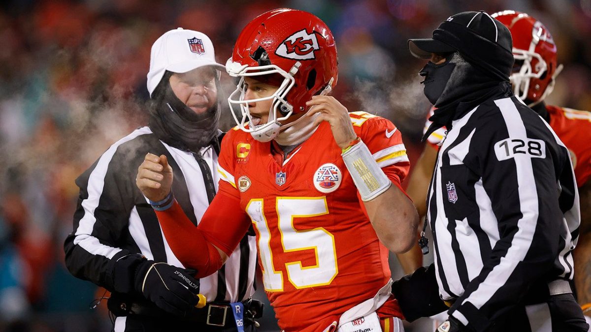 The Chiefs star initially played with a broken helmet, but officials intervened and had him backed up from the sideline. But the reserves had been sitting out in the freezing cold all night, making it difficult for Mahomes to get on top of them. It took some work with the equipment manager on the sideline between series to finally get him comfortable.