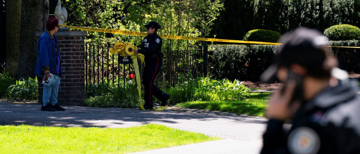 A Toronto Police officer walks outside of 21 Park Lane Circle after a security guard was shot outside the Bridle Path mansion of Canadian rap star Drake in Toronto, Ontario, Canada May 7, 2024. REUTERS/Arlyn McAdorey