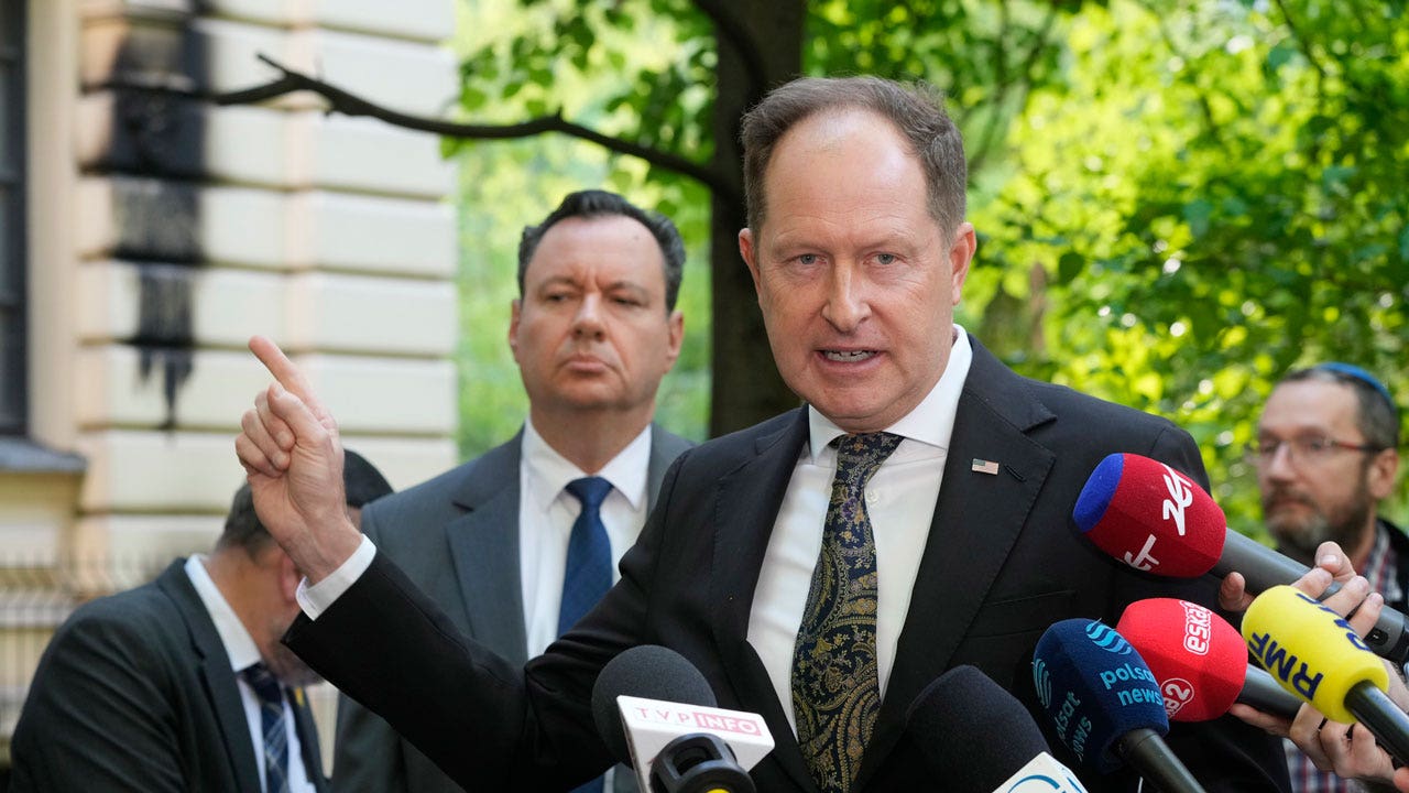 Israeli Ambassador to Poland Yakov Livne (left) and U.S. Ambassador to Poland Mark Brzezinski speak to reporters during a press conference in front of the Nozyk Synagogue in Warsaw, Poland, Wednesday, May 1, 2024. . The synagogue was damaged in a petrol bomb attack overnight. (AP Photo/Charek Sokolowski)