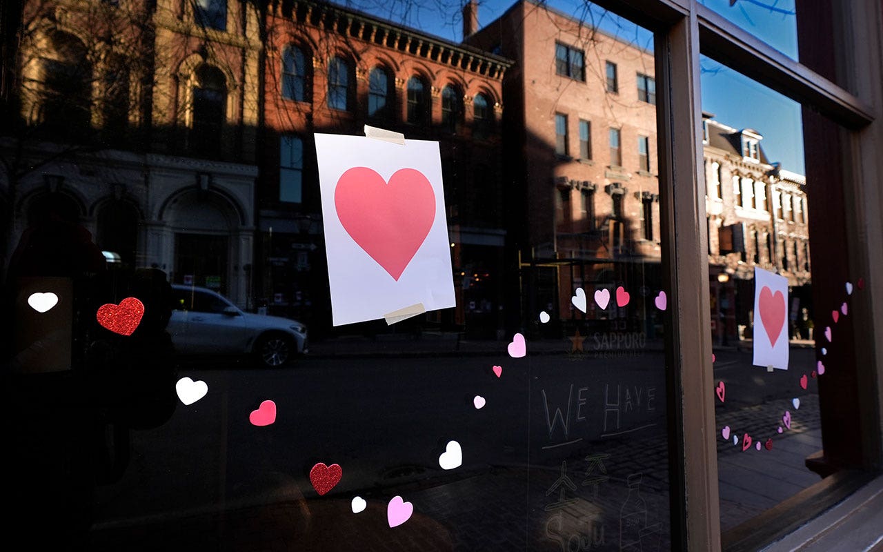 Valentine’s Day hearts decorate a storefront on Exchange Street in Portland, Maine on February 14, 2024. The public has been helping to remember Kevin Fuhrman, the Valentine’s Day thief who secretly hung hundreds of red paper hearts around town every February 14th. Fuhrman passed away last year. (AP Photo/Robert F. Bucati)