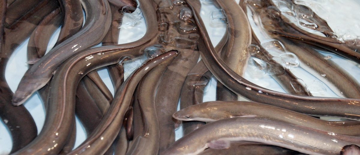 This photo shows eels in an aquarium at the Fisheries Research and Education Agency on the outskirts of Minamiizu, Shizuoka Prefecture, on October 25, 2021. (Photo by BEHROUZ MEHRI/AFP via Getty Images)