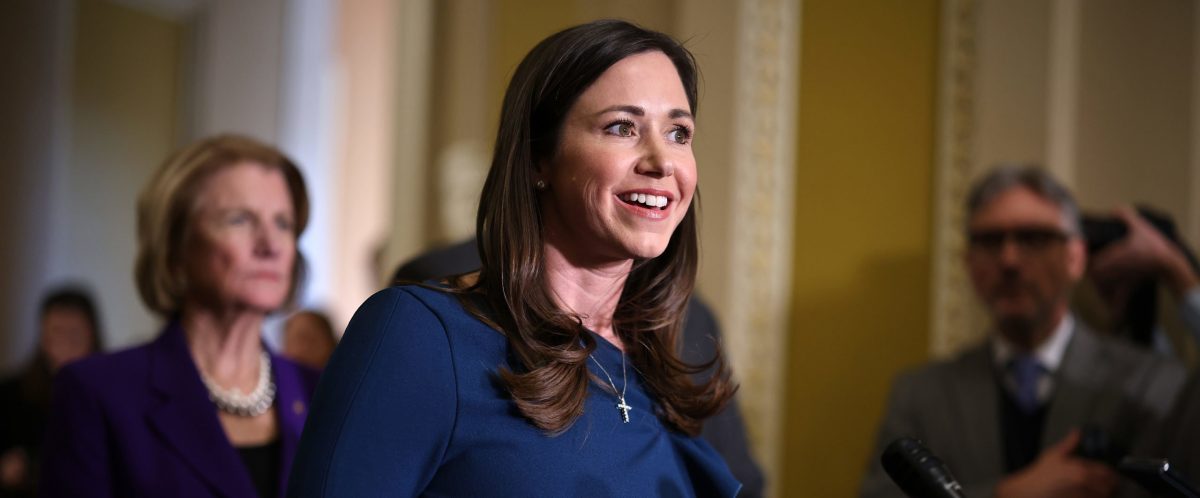 WASHINGTON, DC – Jan. 14: Sen. Katie Britt (R-AL) speaks to reporters following the weekly Senate Republican Caucus Policy Luncheon at the Capitol. Britt spoke about the support of both parties for the Laiken Riley Act, which was appointed to commemorate a 22-year-old nursing student killed by illegal immigrants last year. (Photo by Somodevilla/Getty Images)