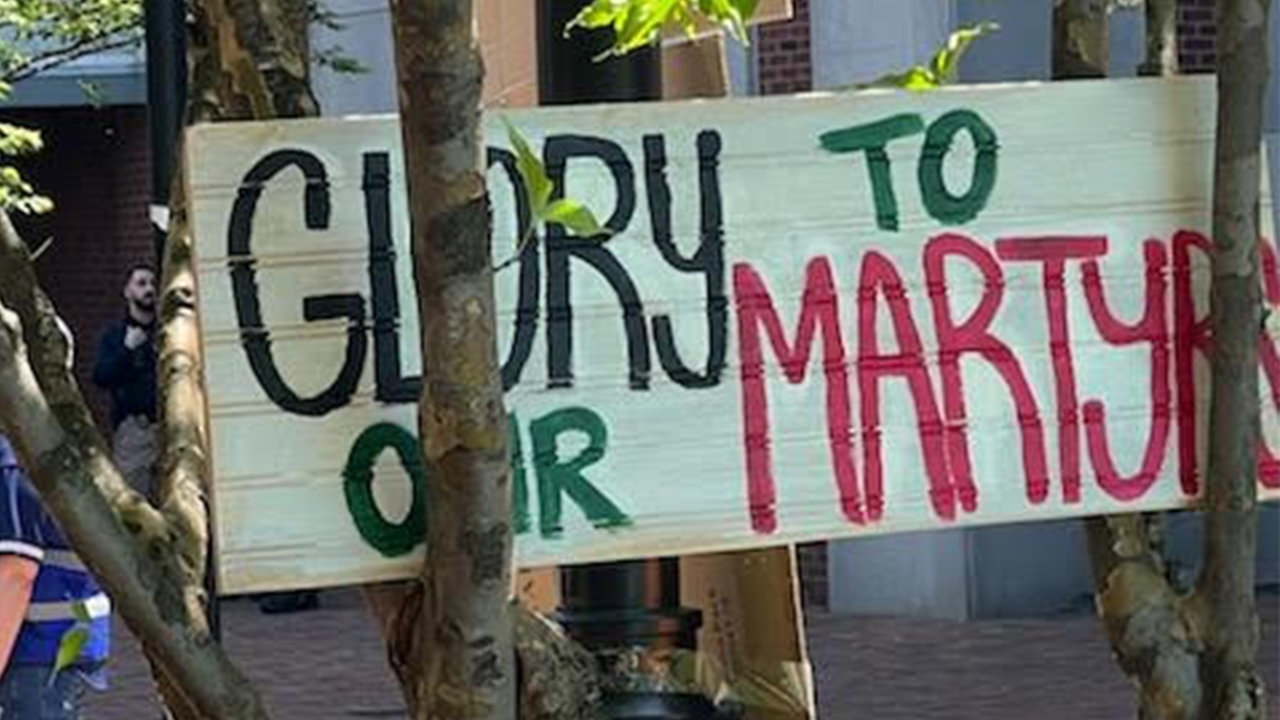A “Glory to the Martyrs” sign stands on a tree on Rutgers University's Newark campus. (Christopher L. D'Alessandro)