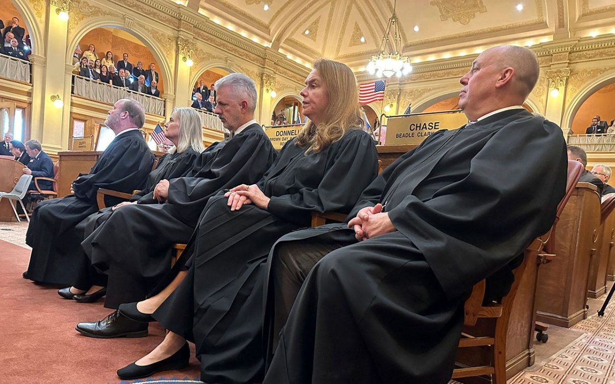 South Dakota Supreme Court justices listen to Gov. Kristi Noem’s State of the Union address on the House floor at the state Capitol on Jan. 9, 2024, in Pierre. SD Noem held two seats, one of which was in place. Empty for months. (AP Photo/Jacques Dura Jacques)