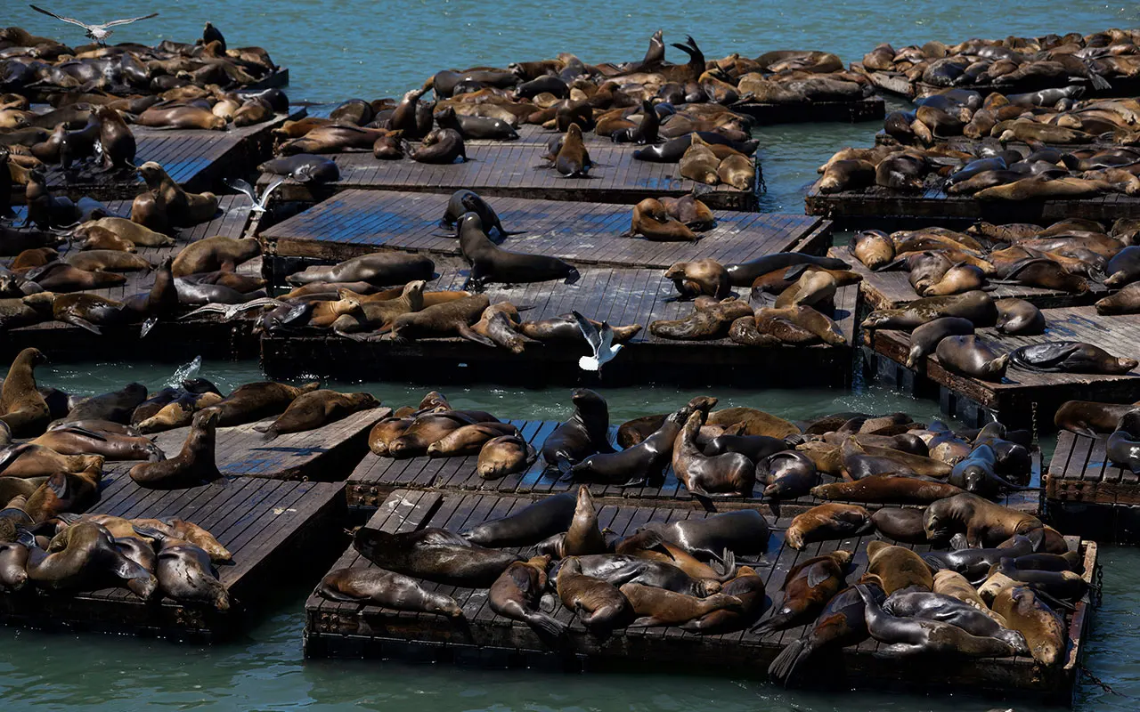 Sea lions first appeared on Pier 39 after the 1989 earthquake and have become a famous tourist attraction. The number of sea lions – loud, barking marine mammals that can weigh up to half a tonne – colliding with piers varies by season. More than 100 can be seen on most days.