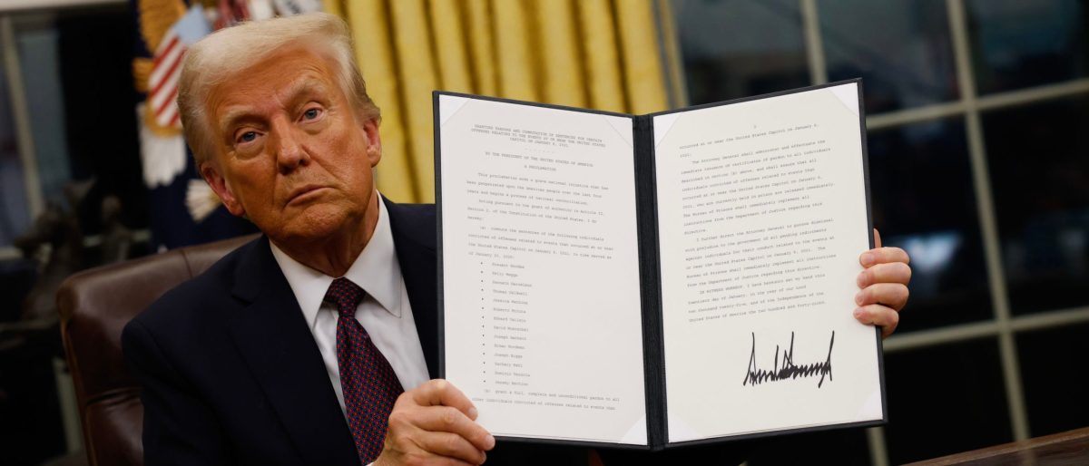 WASHINGTON, DC – JANUARY 23: U.S. President Donald Trump holds up a signed executive order in the Oval Office of the White House on January 23, 2025 in Washington, DC. Trump signed a range of executive orders pertaining to issues including crypto currency, Artificial Intelligence, and clemency for anti-abortion activists. (Photo by Anna Moneymaker/Getty Images)