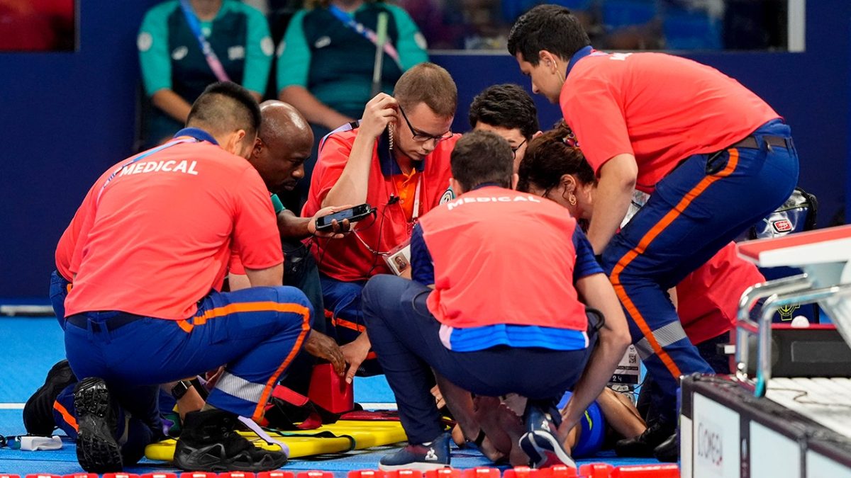 Medical staff carry Slovakia’s Tamara Potocka off on a backboard after the women’s 200m individual medley qualifying round at the La Défense Arena in Paris during the Paris 2024 Summer Olympics. (Rob Schumacher – USA Today Sports)