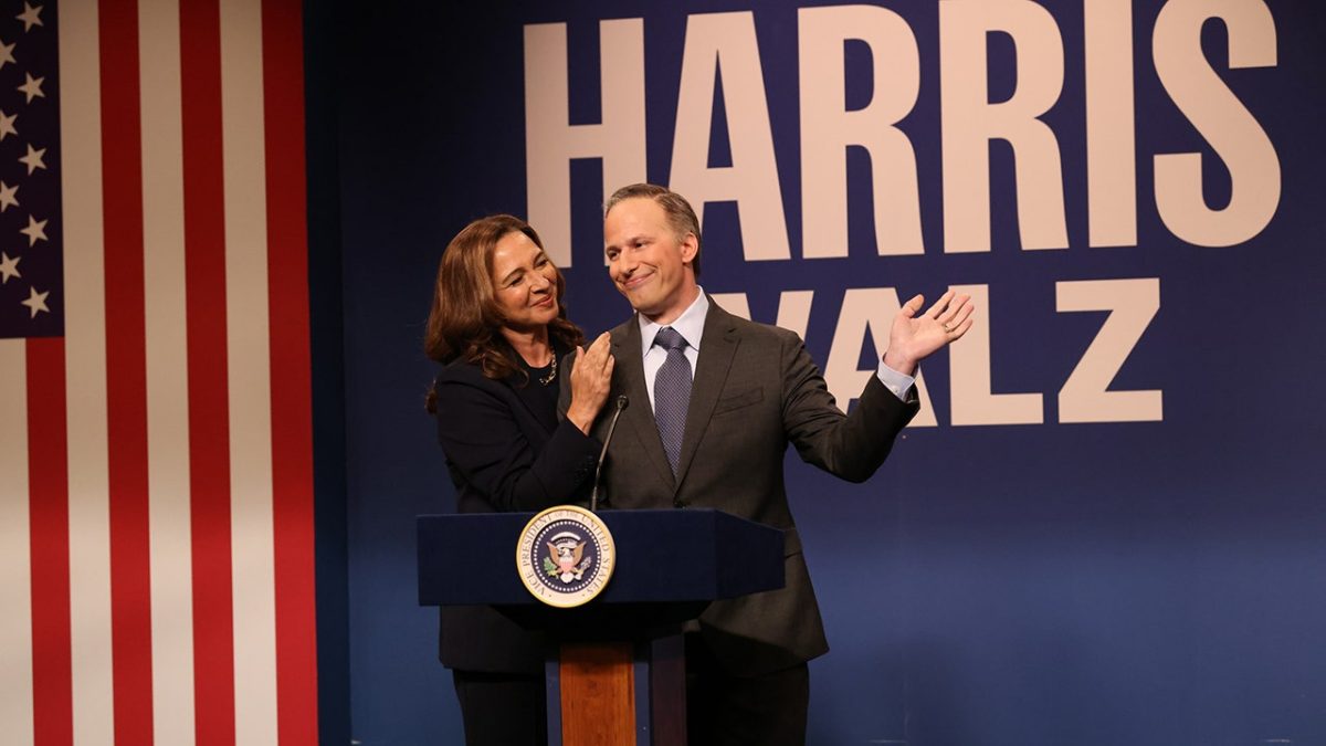 Maya Rudolph as Kamala Harris and Andy Samberg as Douglas Emhoff during the “Campaign” cold open on Saturday, September 28, 2024. (Will Heath/NBC via Getty Images)