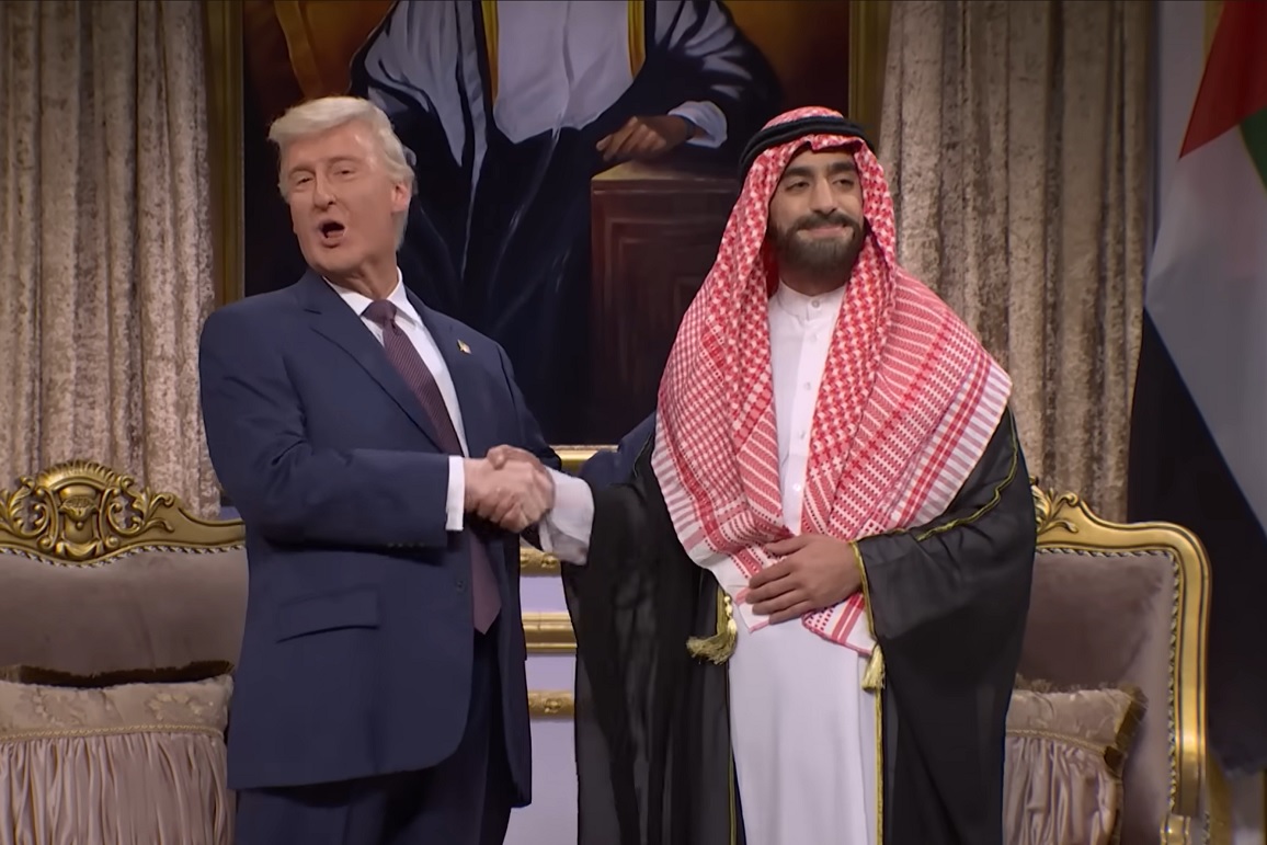 In the sketch, Johnson’s Trump enthusiastically described his travels through Saudi Arabia, Qatar, and the UAE. He and Emil Wakim, portraying MBS, exchanged affectionate terms like “habibi” while joking about trade agreements and some questionable gifts.
