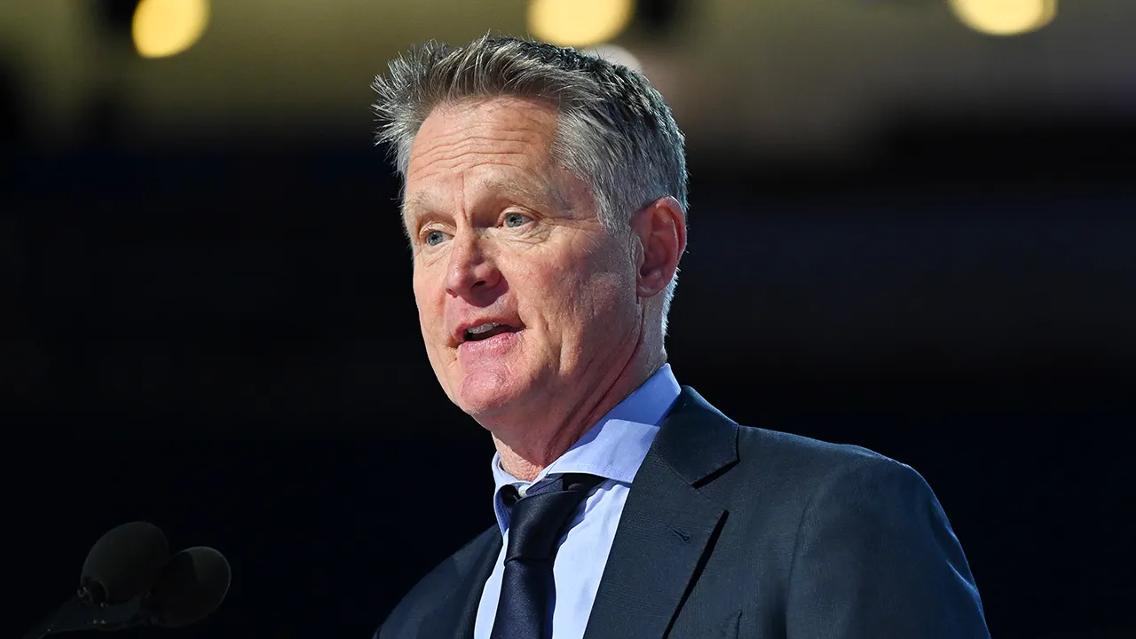 Team USA men's basketball coach and Golden State Warriors coach Steve Kerr speaks on stage during the first day of the Democratic National Convention on August 19, 2024 at the United Center in Chicago. (Brandon Bell/Getty Images)