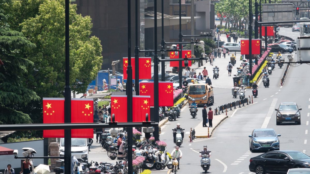 Shanghai, China – As of April 29, pedestrians are navigating streets adorned with Chinese flags in anticipation of the May Day holidays.