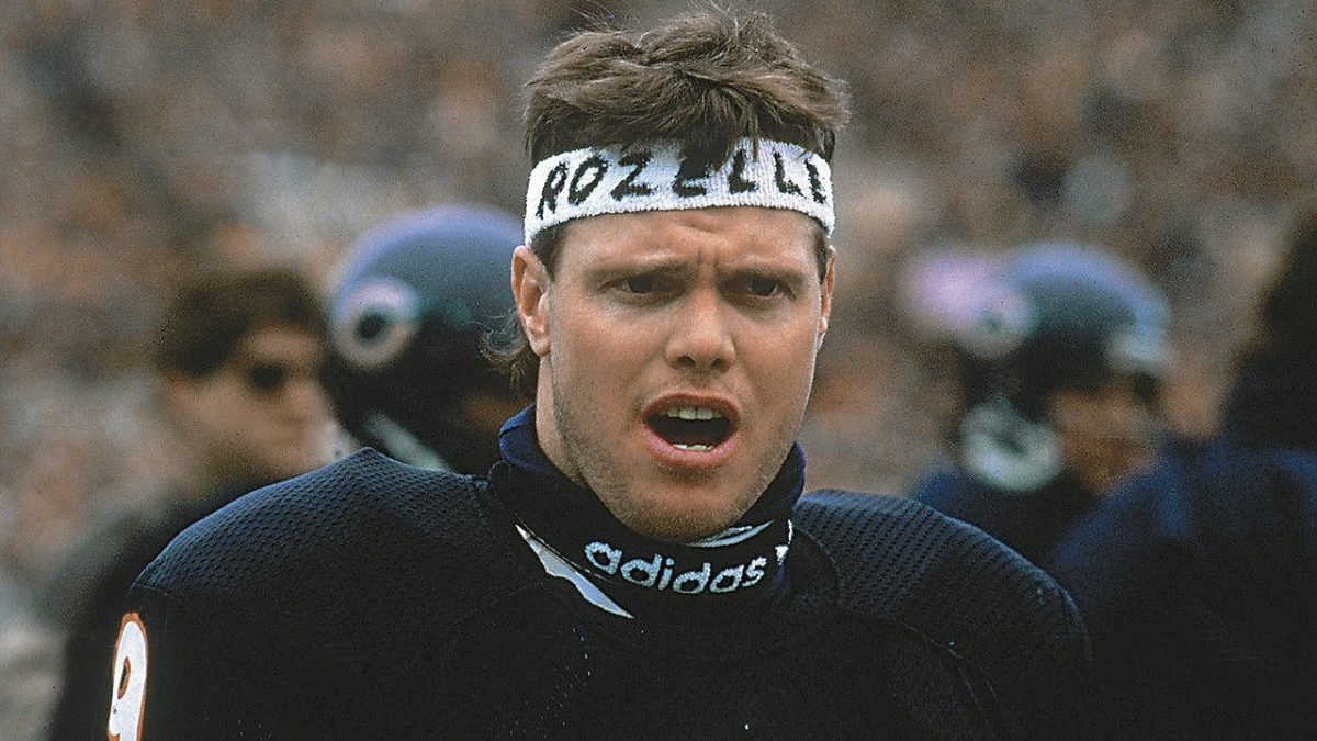 Chicago Bears QB Jim McMahon wears a “ROZELLE” headband before a game against the Los Angeles Rams after being fined by NFL Commissioner Pete Rozelle. (Ronald C. Modra/Sports Illustrated via Getty Images)