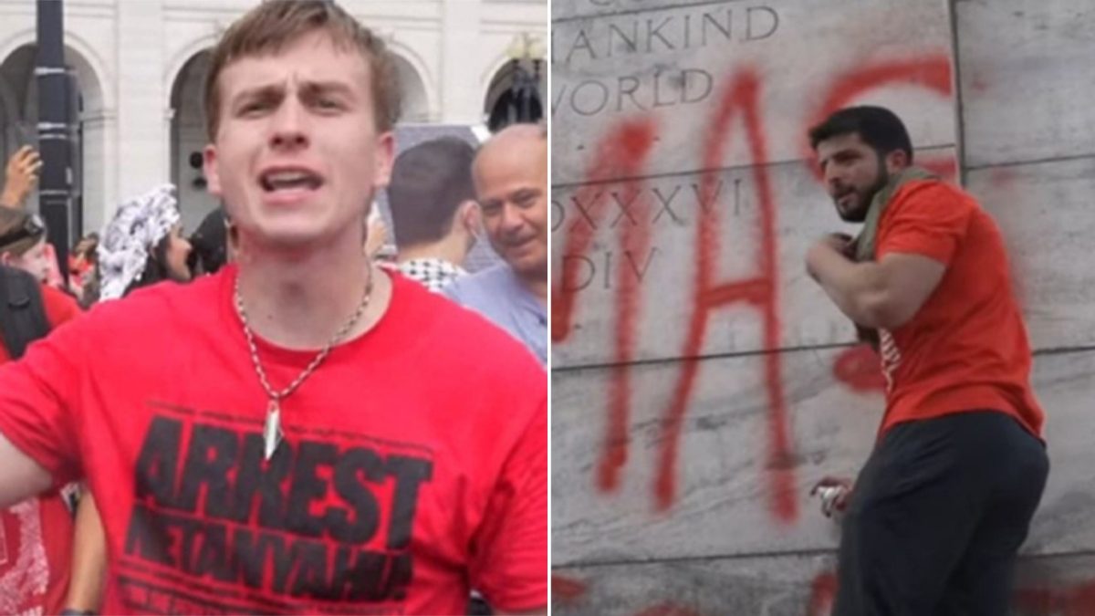 At Union Station, agitators burned an American flag, vandalized a statue of Christopher Columbus with the words “Here Comes Hamas,” and took down an American flag flying outside the station, replacing it with a Palestinian flag.