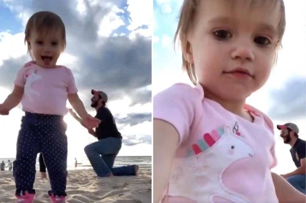 Couples’ adorable daughter photobombs proposal video