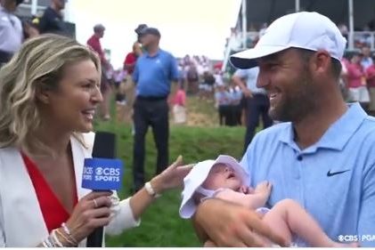Scottie Scheffler holds baby for Amanda Balionis interview after Travelers protester chaos