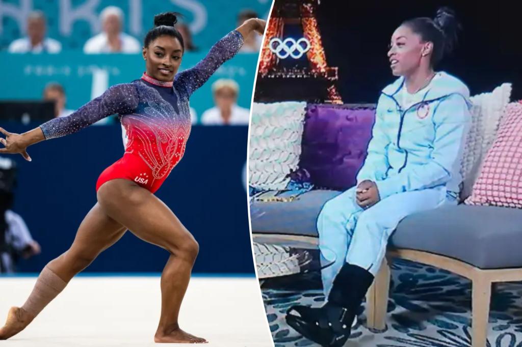 Simone Biles wears walking boot for interview after Olympic injury