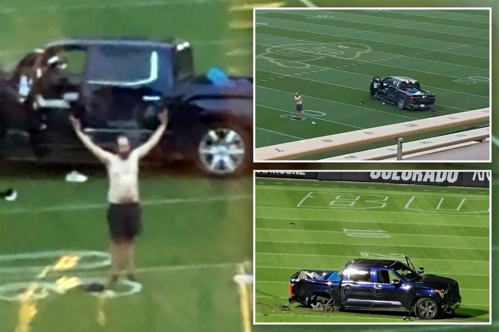 Shirtless suspect drives onto University of Colorado football field after nearly striking bystander in hit-and-run rampage