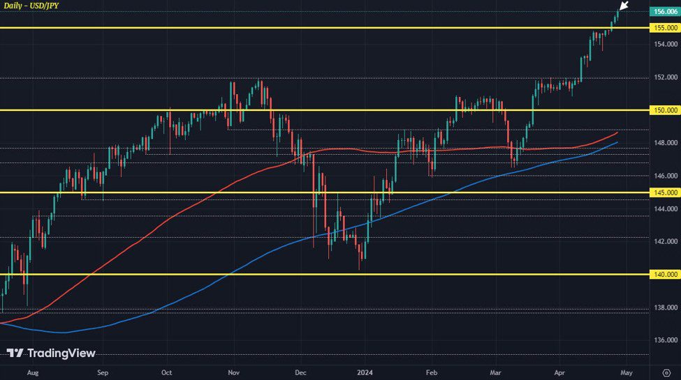 This week’s trading has seen the yen continue to weaken, creating a difficult situation for Japan. The Bank of Japan did not provide much support as USD/JPY has now risen to the 156.00 level, its highest level in over 30 years. So what’s next for this pair? USD/JPY daily chart For now, buyers are cautiously […]