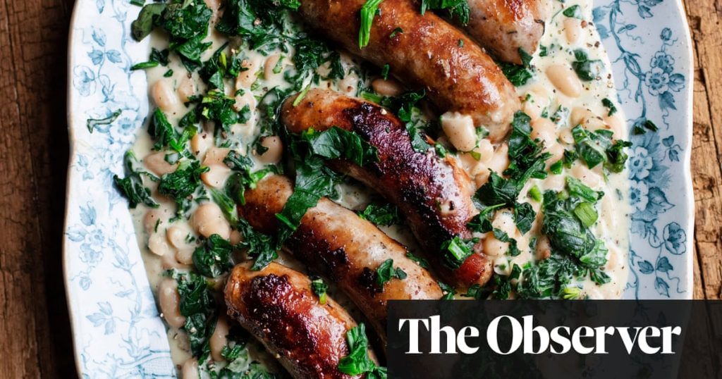 Nigel Slater’s recipes for sausages with spinach and cannellini beans, and artichokes, potatoes, cheese and cider | Sausages