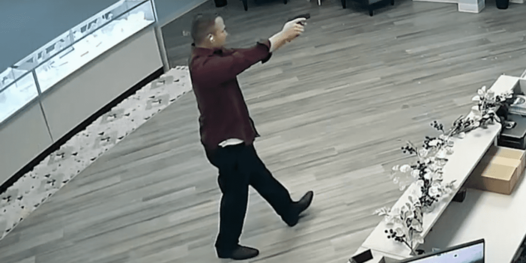 Video: Gun-toting jewelry store owner knows just what to do after burglar breaks in — and shocked crook makes hilarious exit