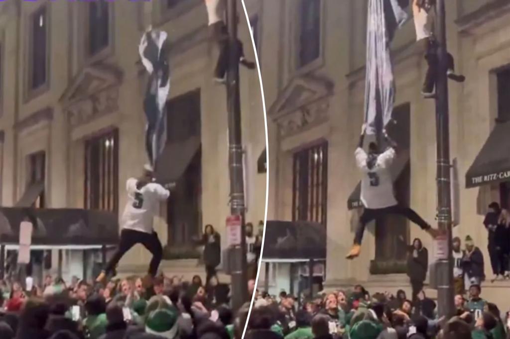 After the Birds punched their ticket to the 2025 Super Bowl on Sunday, one Eagles fan took the “Fly Eagles Fly” chants a little too seriously. A fan wearing an Eagles No. 5 jersey was seen hanging from a flag after climbing a pole just outside the Ritz-Carlton in Center City, Philadelphia, which was torn […]