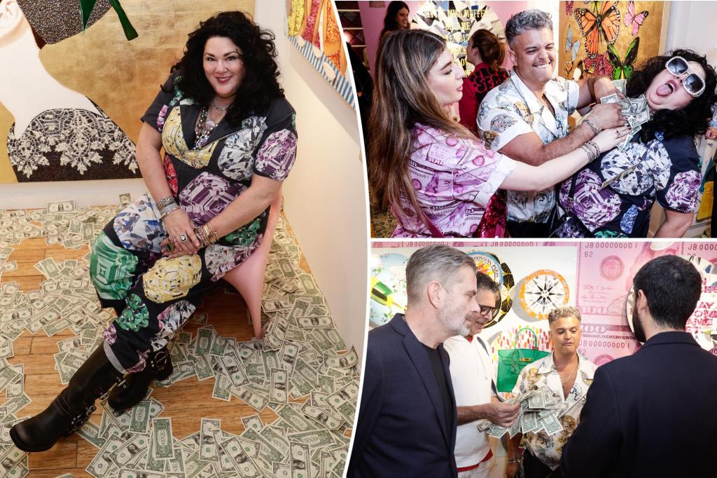 Guests grab wads of cash from Ashley Longshore’s art show