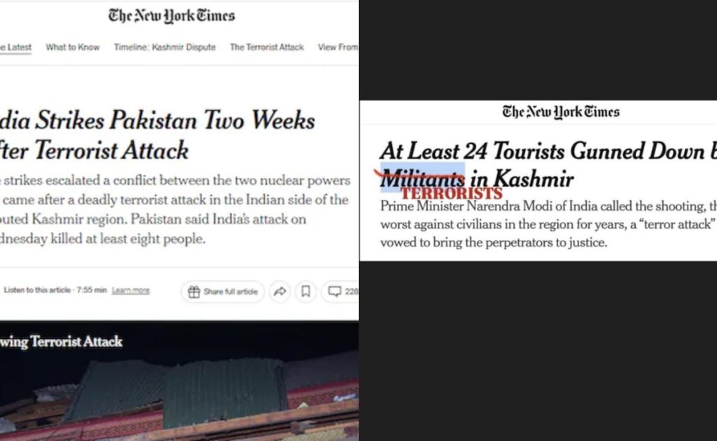 New York, USA Following the execution of Operation Sindore, wherein India targeted a terrorist camp in Pakistan-occupied Kashmir (POK), there have been notable editorial changes in a New York Times report. For the first time, the American publication described the perpetrator of a terrorist attack in Pahargam as a “terrorist” in the headline. This marks […]