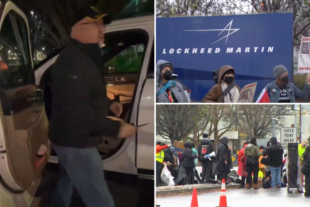 Commuter brandishes knife to ward off rowdy pro-Palestinian protesters blocking him from entering Lockheed Martin facility