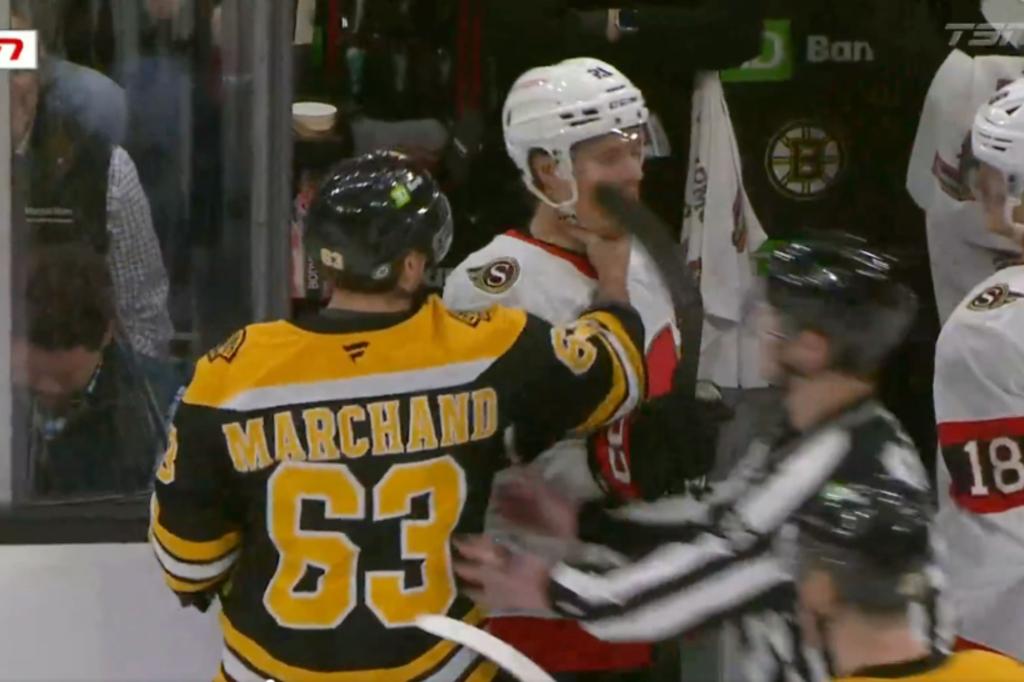 Brad Marchand went a little too far in trying to get his opponent's chest hot. The Bruins' famous instigator put his hand around the neck of Senators forward Nick Cousins during the first period of Boston's 2-0 win Thursday night. Tensions between the teams were high from the start, and Ottawa resumed its fightback with […]