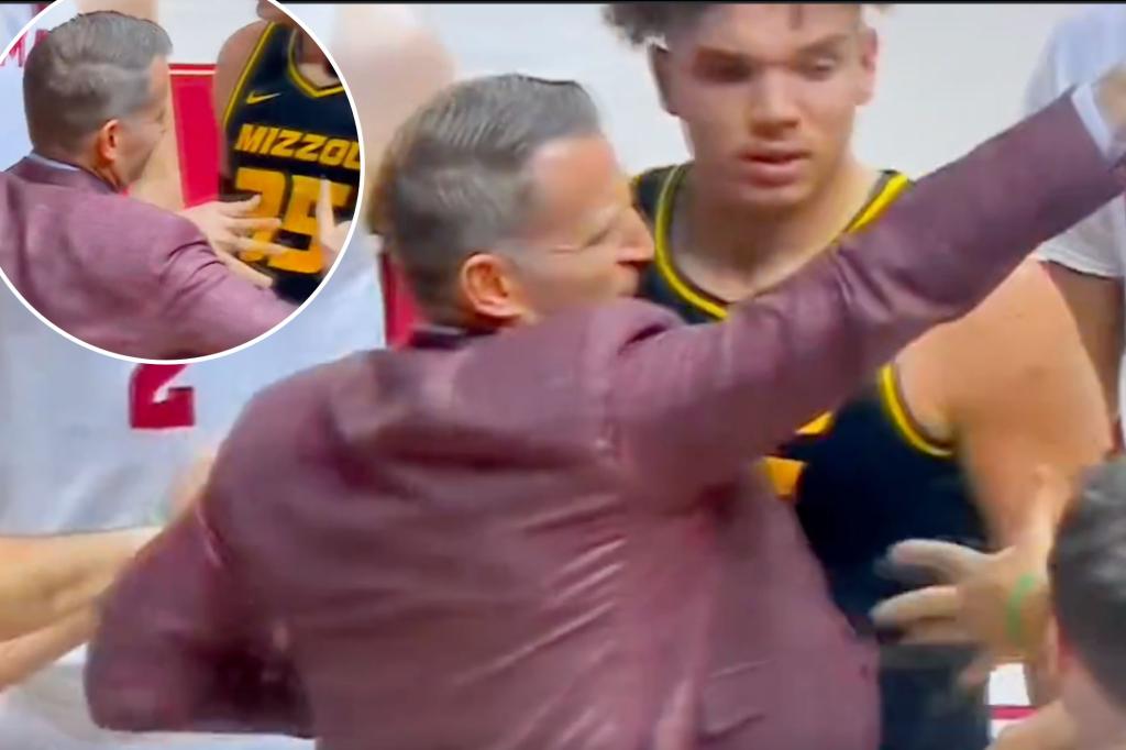 Alabama coach Nate Oats shoves Missouri’s Aidan Shaw on court