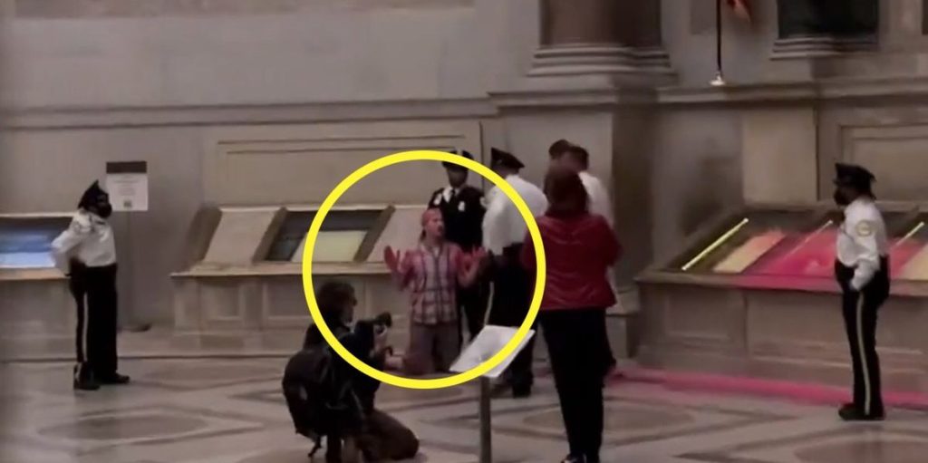 Law enforcement quickly arrested two protesters Wednesday for allegedly dumping a red powder substance on an exhibit that included an actual U.S. Constitution. At around 2:30 p.m., two protesters stormed into the U.S. Constitution exhibit at the National Archives in Washington, D.C., and threw a red powder substance at themselves and the Constitution exhibit, according […]