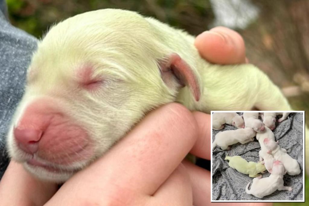 Golden Retriever puppy with rare green fur goes viral