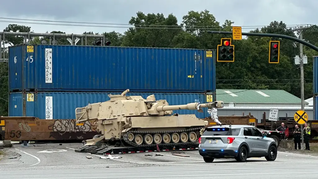 Train collides with military mobile artillery vehicle being hauled on a semi-truck