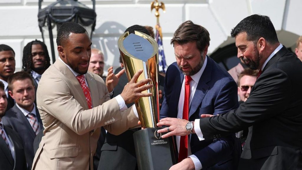 Vice President JD Vance, an Ohio State alumnus, wanted to meet with the White House Buckeyes football team on Monday to celebrate the team’s national championship. However, he needed those Buckeyes to help him a little after he almost groped for their big gold trophies on the White House lawns. After President Donald Trump, Vance […]