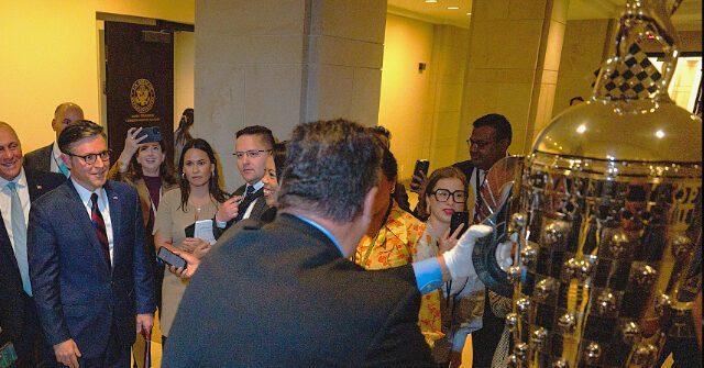 Mike Johnson, Instead of Working for Republicans, Celebrates Giant Trophy Being Brought into Congress