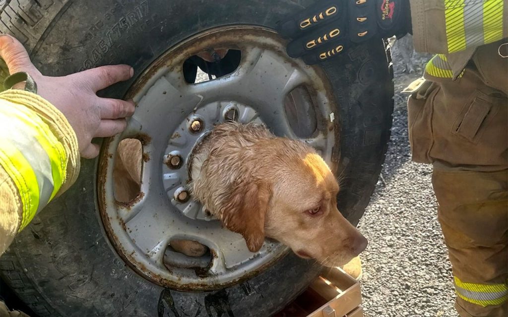 NJ firefighters come to the rescue of yellow Labrador stuck in spare tire