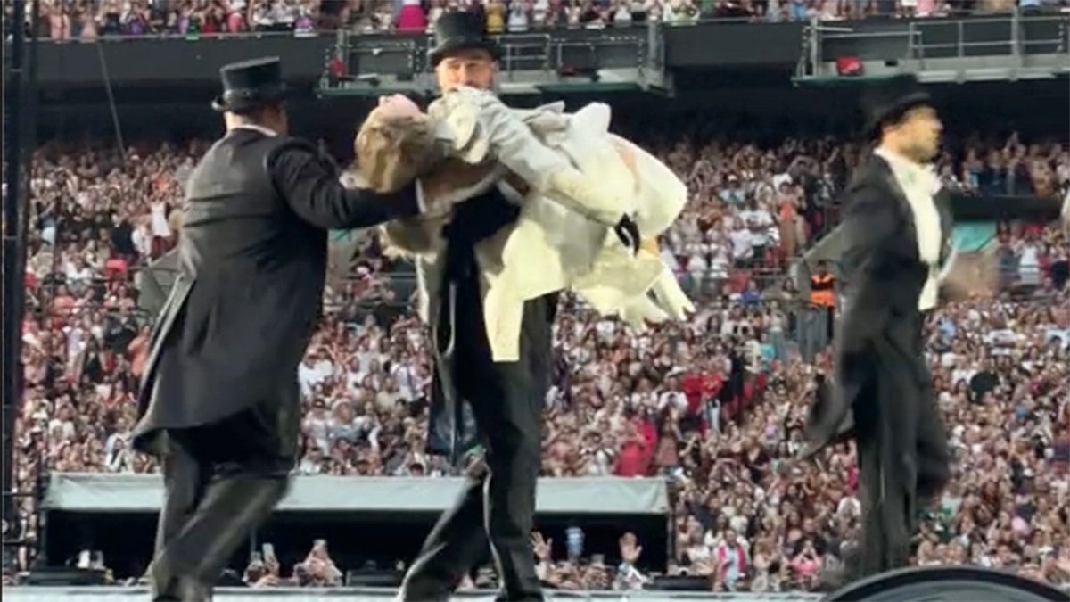 Kansas City Chiefs star Travis Kelce appeared on stage at Taylor Swift's Eraser Tour in London in June, her international pop tour. Kelce appeared onstage in a top hat and black suit and tails. In a skit, Kelce took an apparently unconscious Swift in his arms and slumped her down on a red couch.