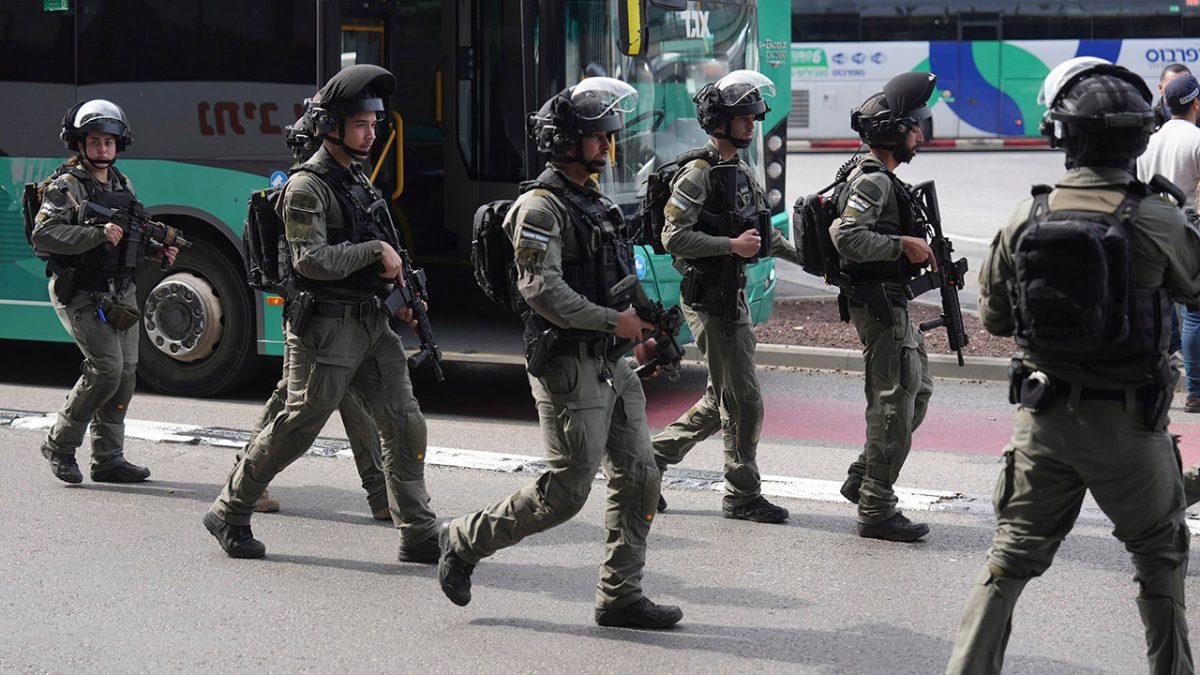 Israeli security forces secured the scene of a stabbing attack in Haifa, Israel on Monday, March 3, where a 70-year-old man was killed and four others were injured. (AP/Ariel Schalit)