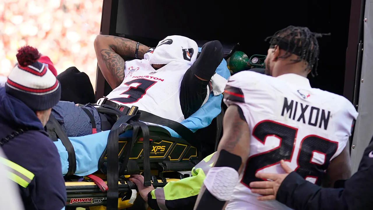 Houston Texans wide receiver Tank Dell is carried off the field on a stretcher after being injured while catching a touchdown pass during the second half of an NFL football game against the Kansas City Chiefs on Saturday, Dec. 21, 2024. Cover your face. Kansas City, Missouri (AP Photo/Ed Zurga)