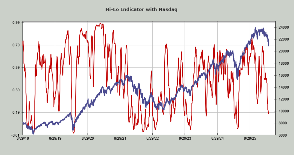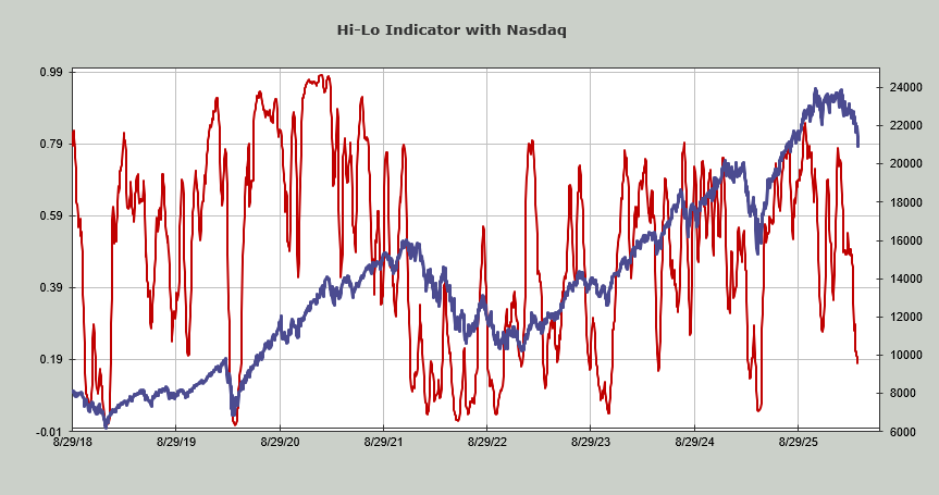 Some indicators suggest that the NASDAQ Hi-Lo is currently oversold, sitting at 0.18. The NYSE Hi-Low Index remains at 0.35, indicating the need for further downward pressure. There’s a disconnect between large and small-cap indices; the S&P dipped 2% last week while the Russell index gained.